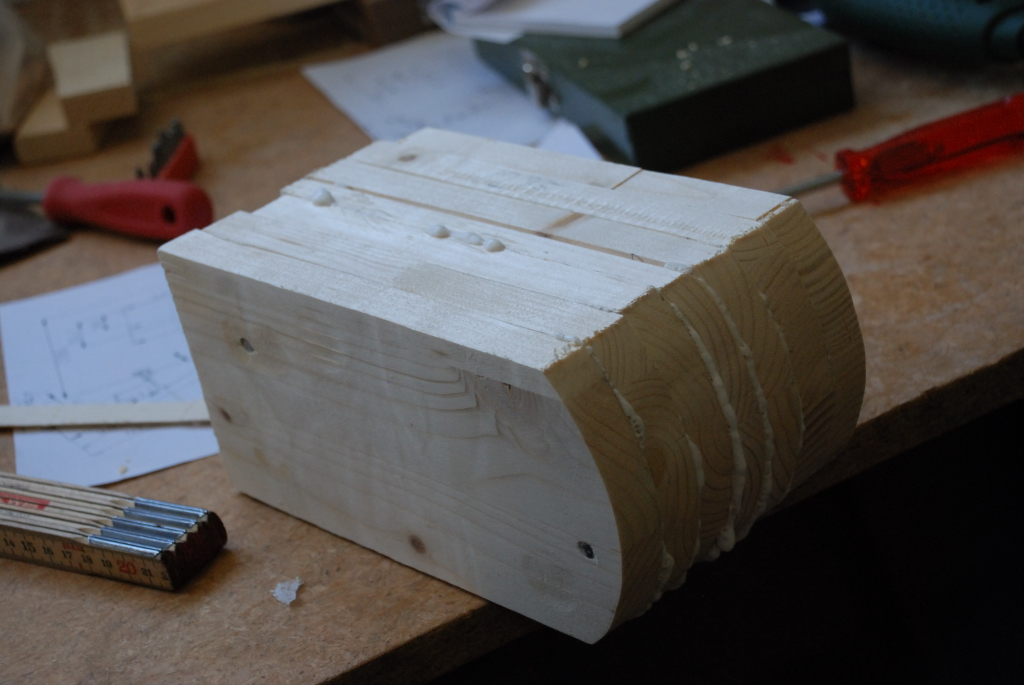 Joceline ist in Kastenbauweise aufgebaut. Die wesentlichen Holzteile, Unter- und Oberlade sowie die Achse, sind hohl bzw. im Falle der Unterlade mit Bauschaum ausgeschäumt. Die Achse ist aus einem 12x12cm Weisbuchenstück gedrechselt und verkastet (fast schade um die schöne Weissbuche). Der Flug und die Kammern sind doppelwandig aus PVC-Rohren ausgeführt, der Zwischenraum ebenfalls ausgeschäumt. Das zentrale metallene Richthorn aus rostendem 6mm Stahl wird in der Unterlade arretiert, führt durch die Oberlade und weist alle 3 Grad ein Richtloch auf.