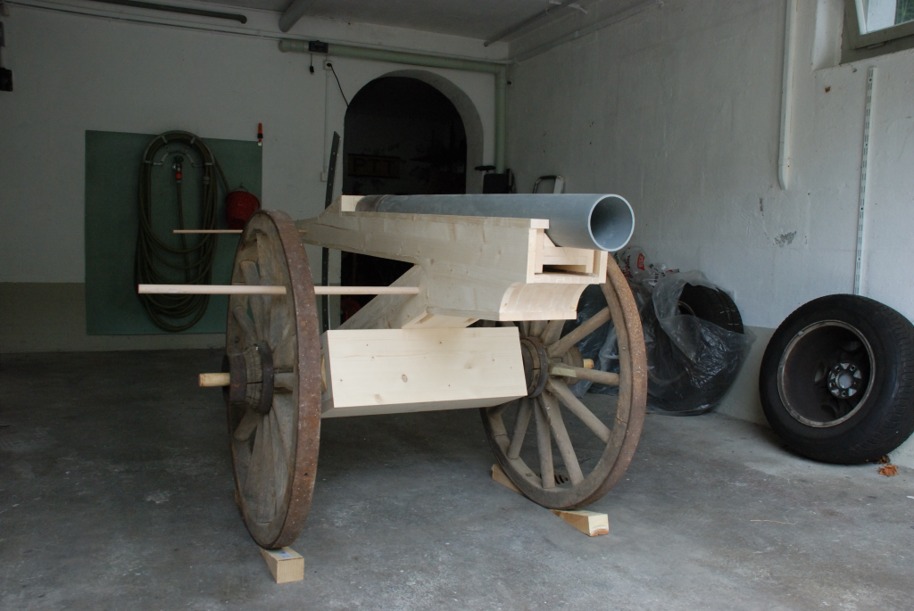 - Das rollbare Gestellt des Geschützes, bestehend aus Unterlade, Oberlade, Achse, Rädern und Richthorn.