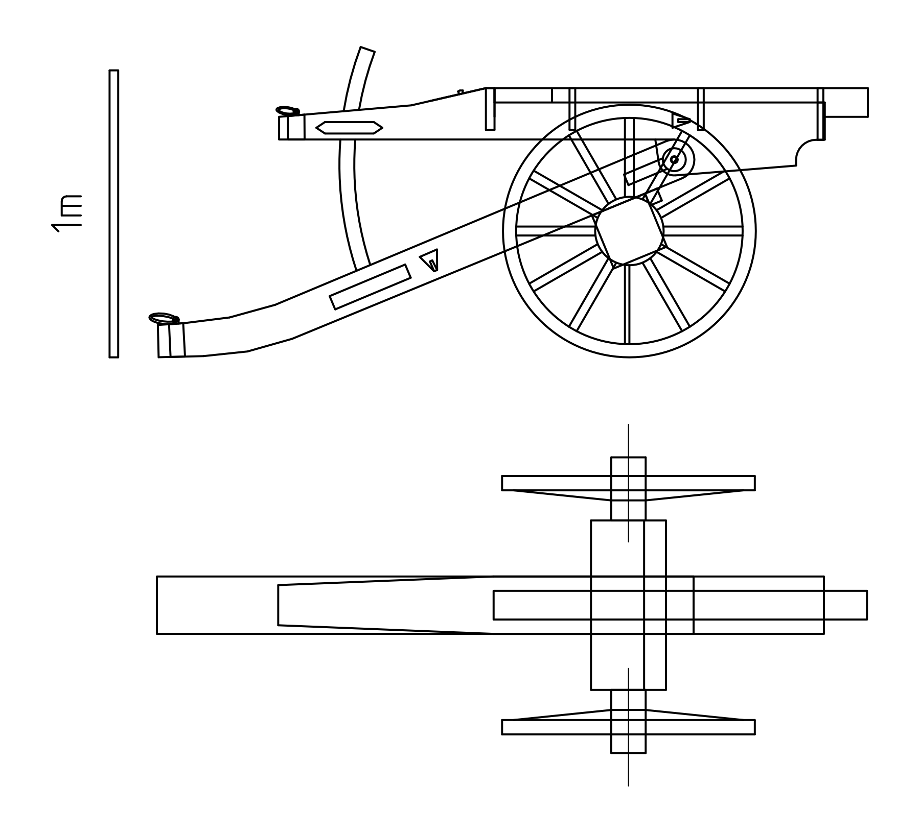 - Ca. 1m langer Stock in dessen Mitte ein Haken zum ziehen des Geschützes angebracht ist.